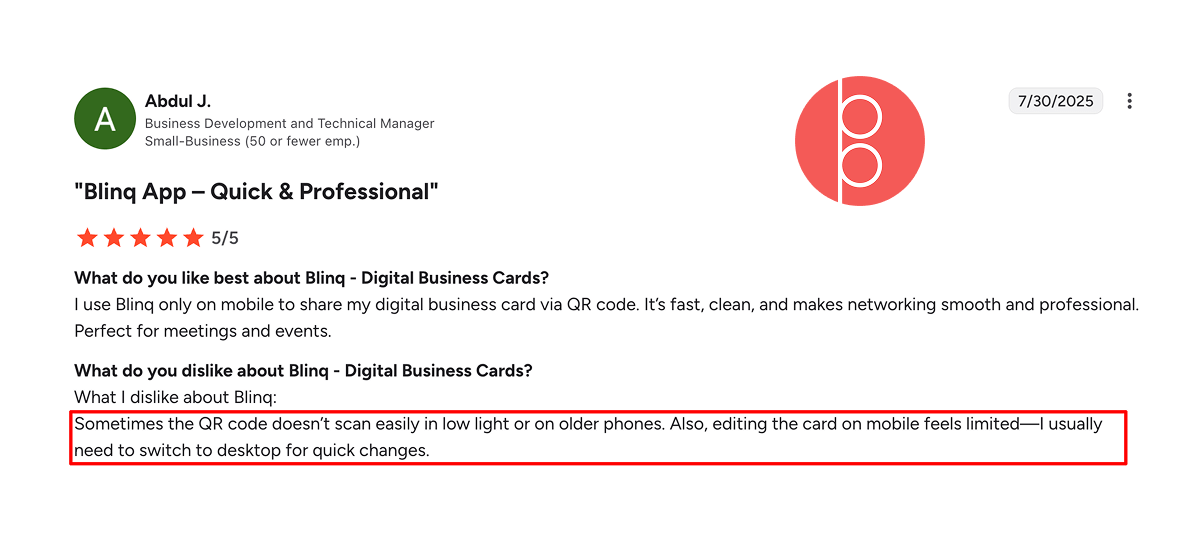 Blinq’s app mirrors its web dashboard—clean, visual, and easy to navigate. Editing cards, updating details, or sharing via QR code or link happens instantly. It’s intuitive and consistent, requiring little learning curve.