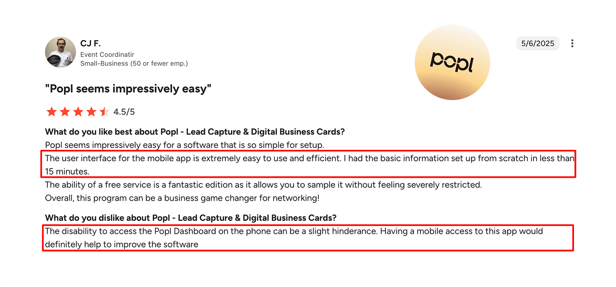 Backed by Y Combinator, Popl moves quickly and experiments often, blending human connection with smart automation. With ratings of 4.7/5 on Capterra and 4.6/5 on G2, it’s become a favorite among sales, marketing, and event teams that rely on in-person networking to drive results.