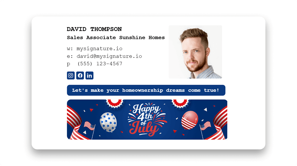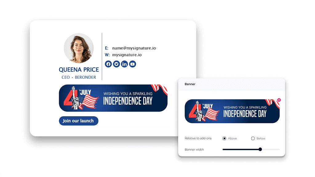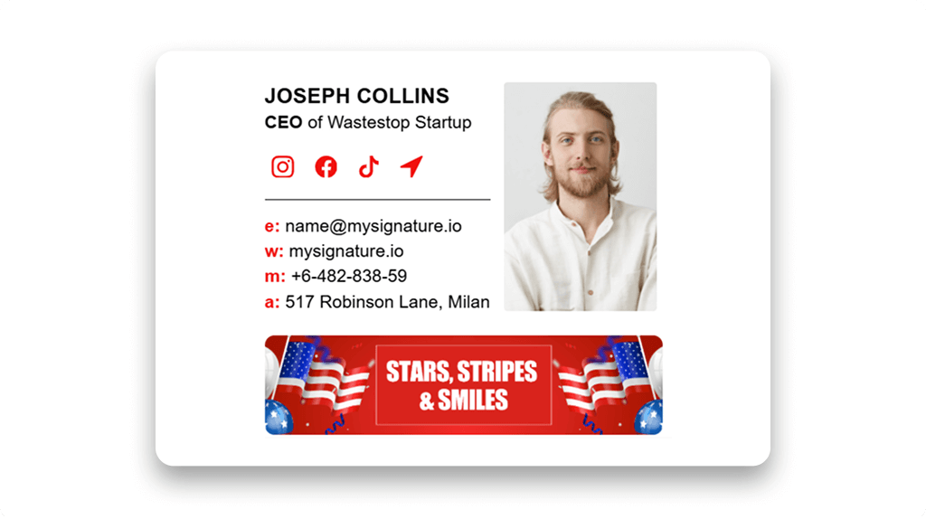 A vibrant red, white, and blue Independence Day banner instantly evokes a sense of patriotism. It’s ideal for seasonal promotions or just a hint of festive spirit. When you create an email signature, including a promotional banner in your signature block expresses pride in your country while keeping things professional. Pair it with a brief greeting or a customer-centric message to strike a balance between visual appeal and relevance.