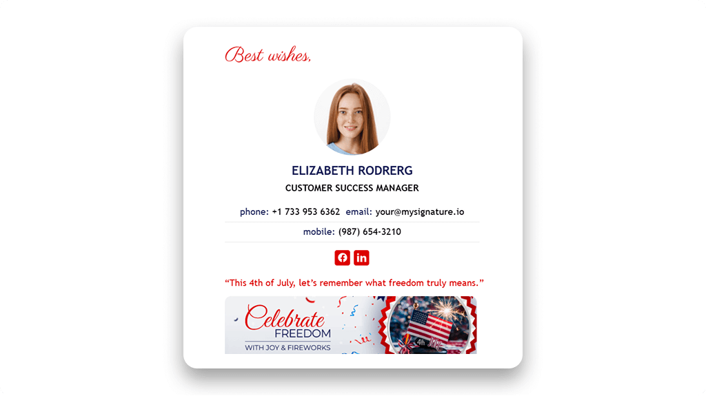 A cheerful 4th of July email signature does more than just dress up your emails—it’s an opportunity to make each message stand out. By using email templates that include social media links and a clear call-to-action, you can turn your signature into a powerful tool for engagement and promotions. Thoughtful visuals and heartfelt messages can stir emotions while capturing the essence of the holiday. Whether you’re highlighting special offers, directing readers to your blog, or simply sending warm wishes to your audience, your signature ensures the right message hits home at just the right moment.