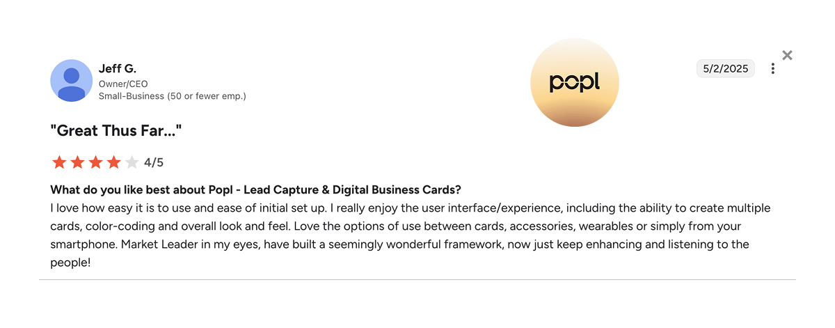 Popl earns high marks for simplicity and guided onboarding. Out of more than 5,000 G2 reviews, nearly 2,000 specifically mention its ease of use, and over 1,300 highlight how easy it is to share.