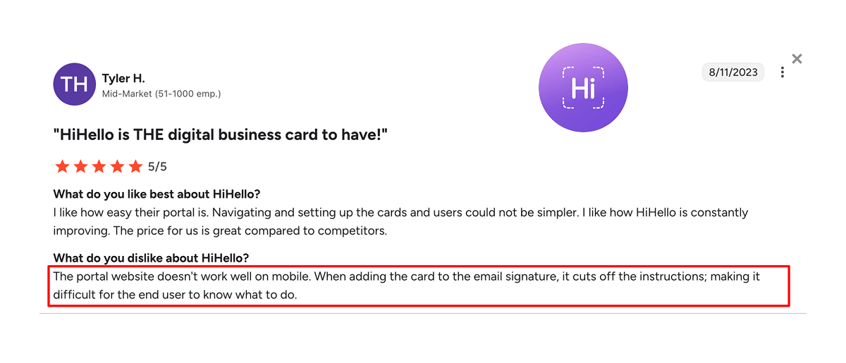 [Alt: A screenshot of HiHello’s G2 rating breakdown]