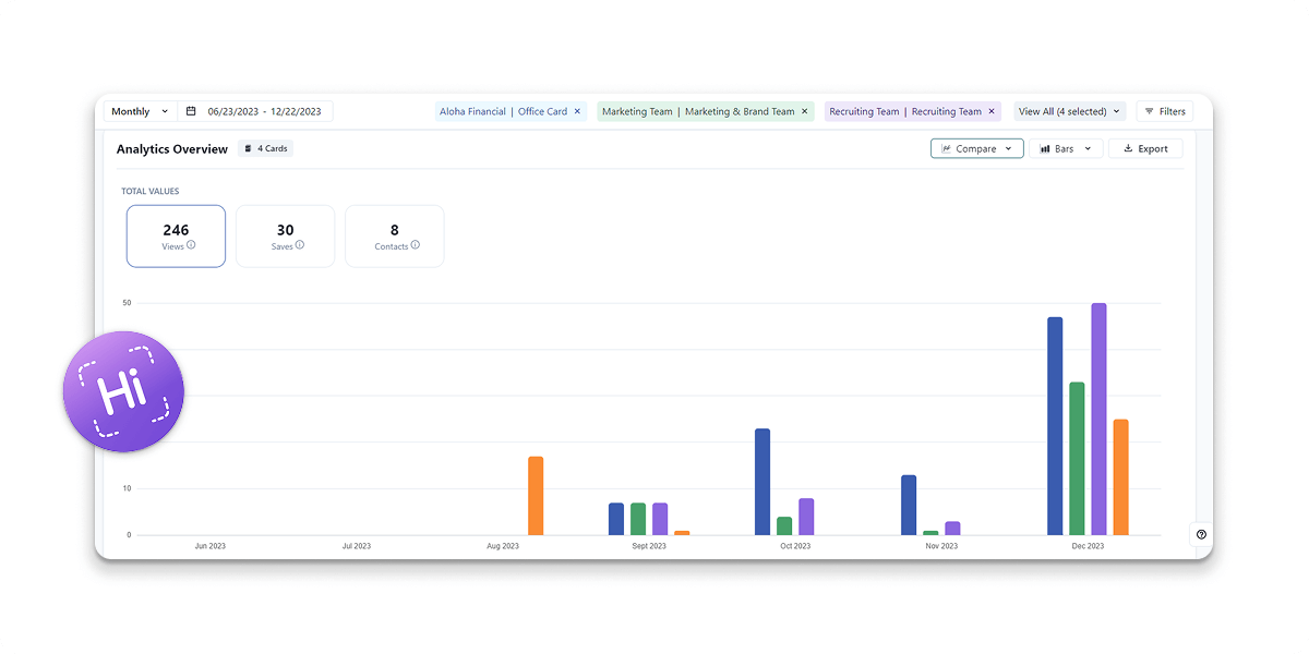 HiHello’s analytics focus on visibility and team engagement. Users can track views, shares, and saved contacts, while admins can monitor usage through leaderboards that encourage active sharing.