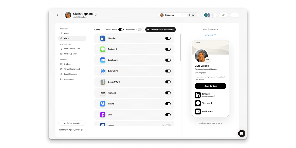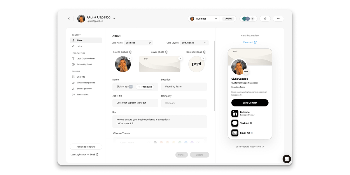 Popl, on the other hand, focuses on uniformity and scalability. Admins can design templates for entire teams, locking in brand colors, layouts, and required fields to keep every card consistent.